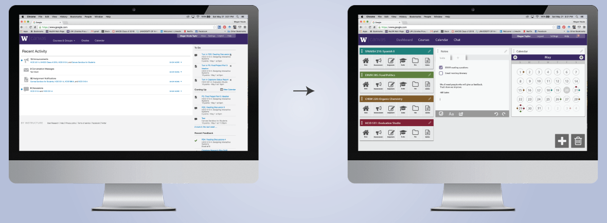 The final skin follows existing Canvas and University of Washington style guides. Dashboard cards are modeled after Google’s material guidelines and harmonious accent colors are used to differentiate class content. Ultimately, the design is intended to feel organized and personalized from the perspective of UW students. Furthermore, the design was guided by Jacob Nielsen’s 10 heuristics for user interface design to maximize usability.